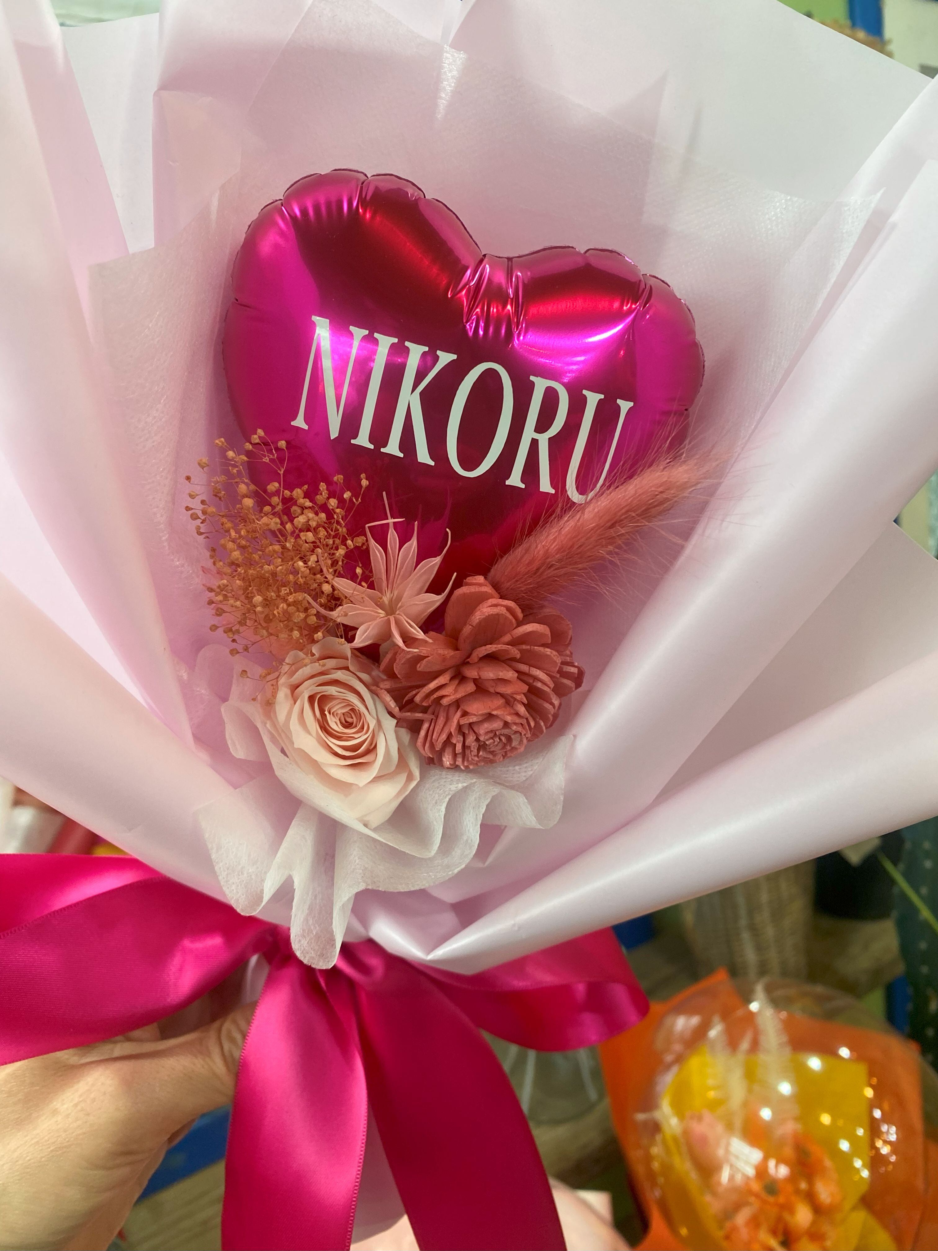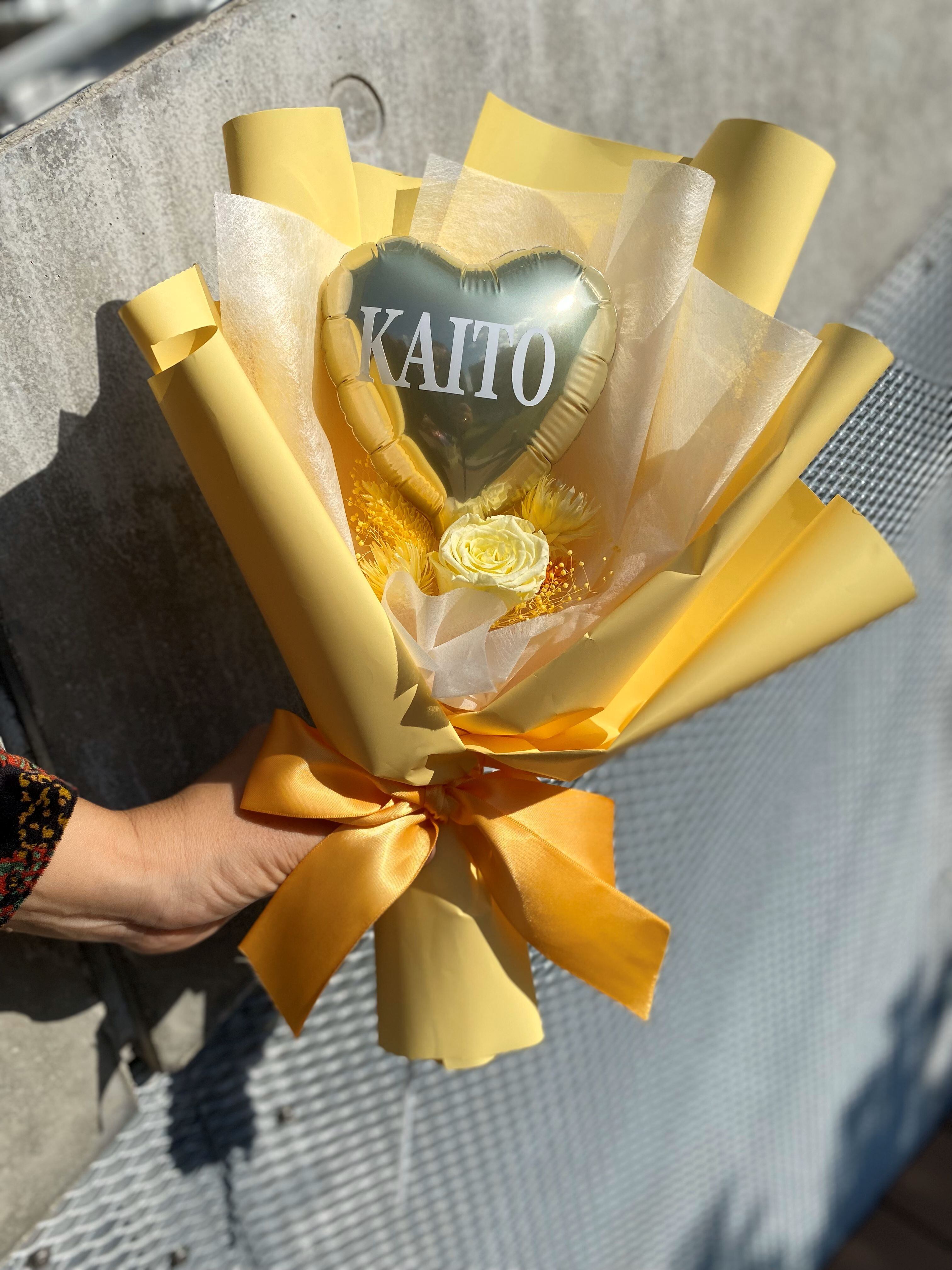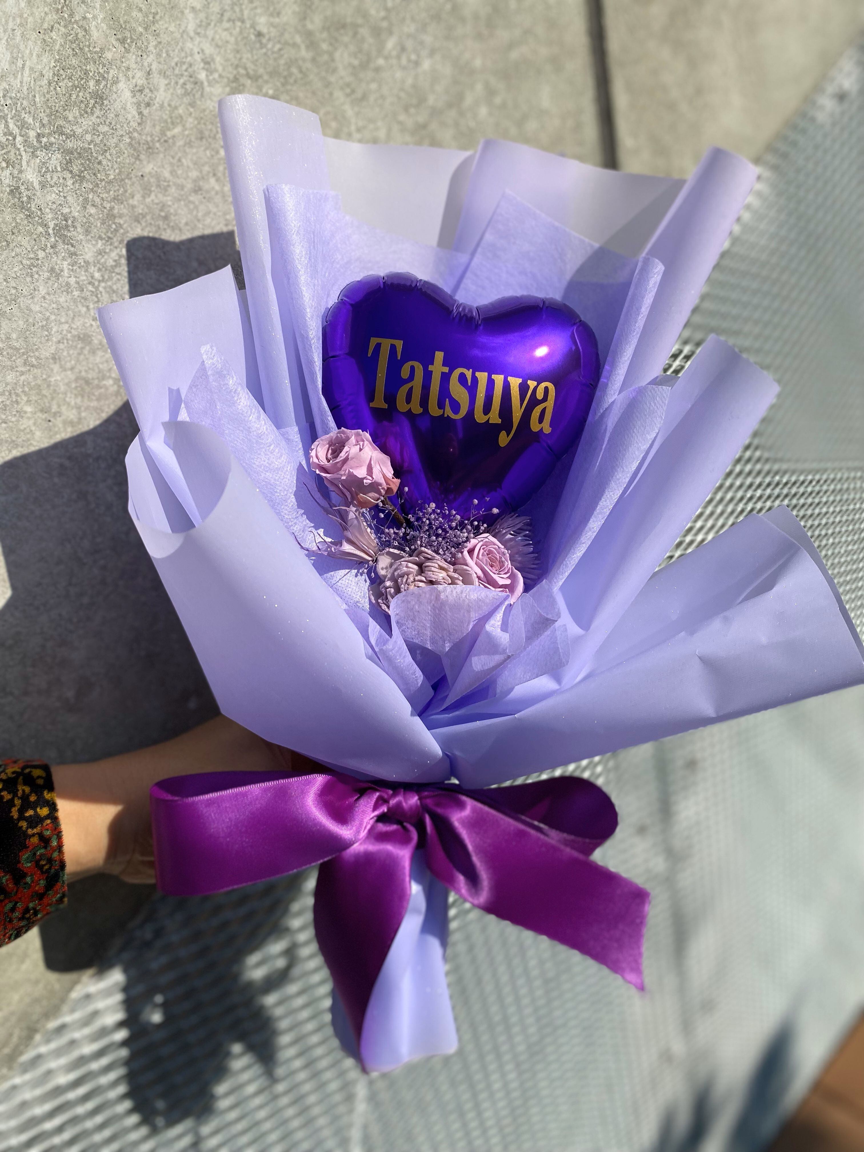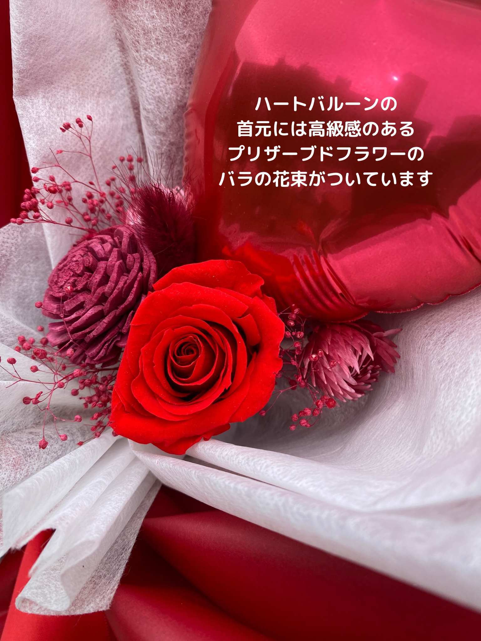 お名前入りハートのバルーンに高級感たっぷりのプリザーブドフラワーブーケです。