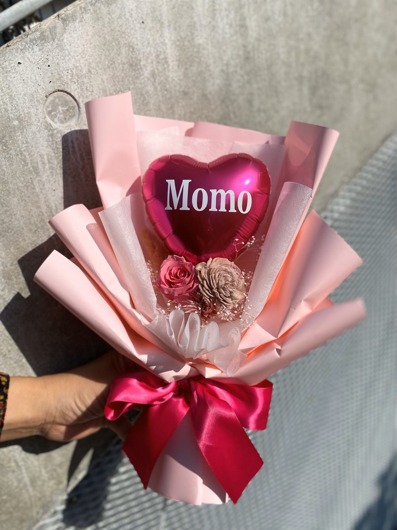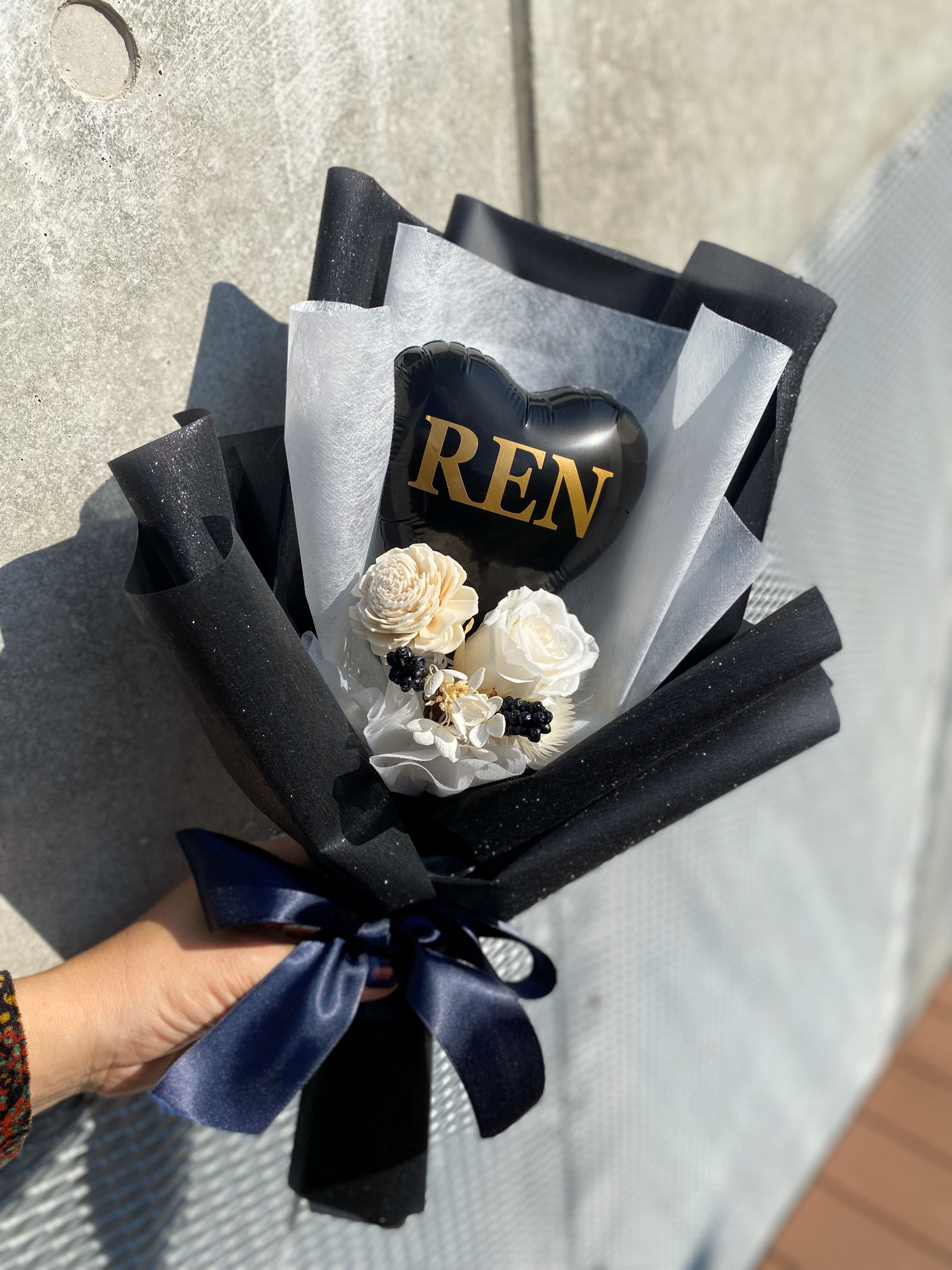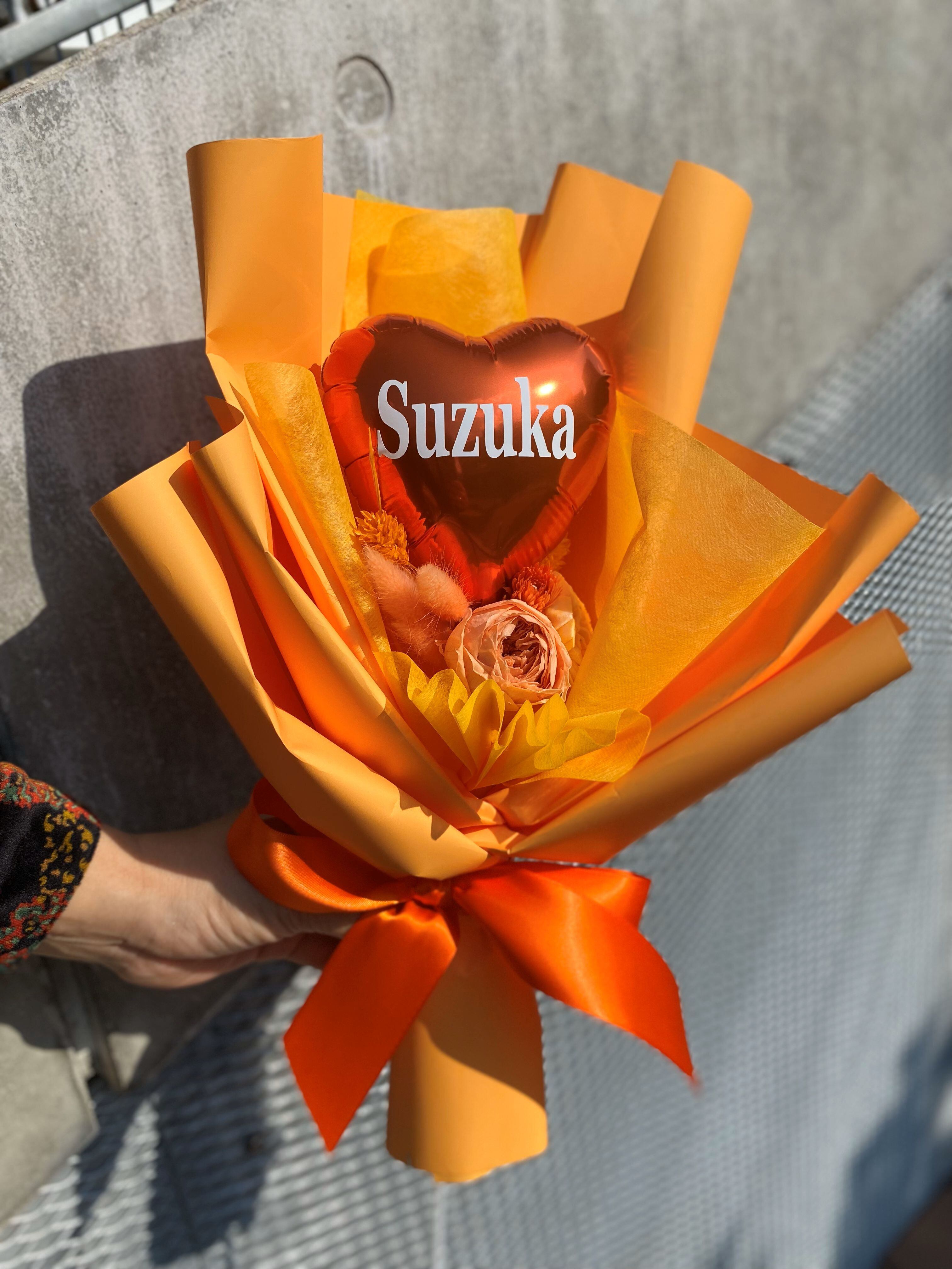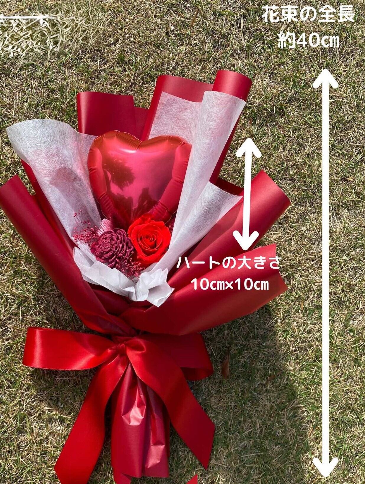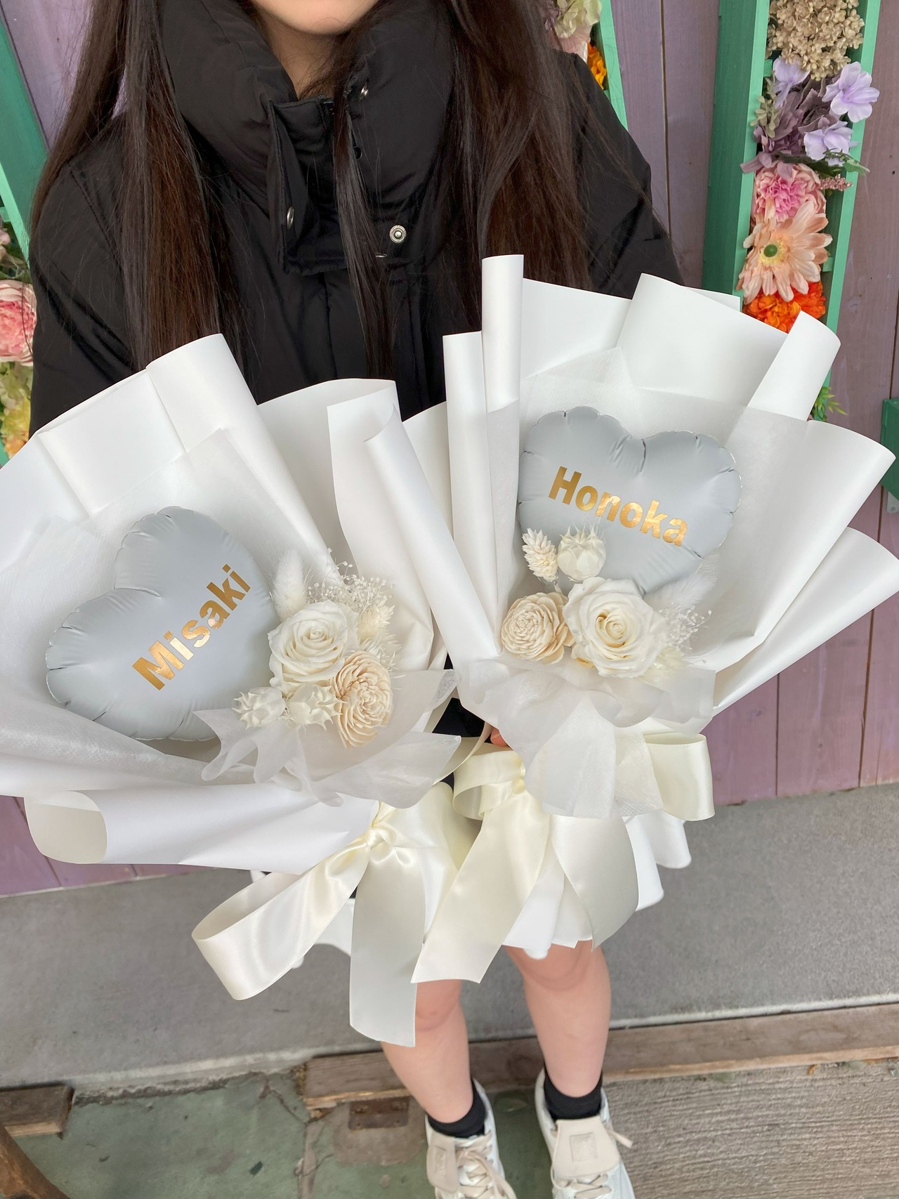 お名前入りハートのバルーンに高級感たっぷりのプリザーブドフラワーブーケです。