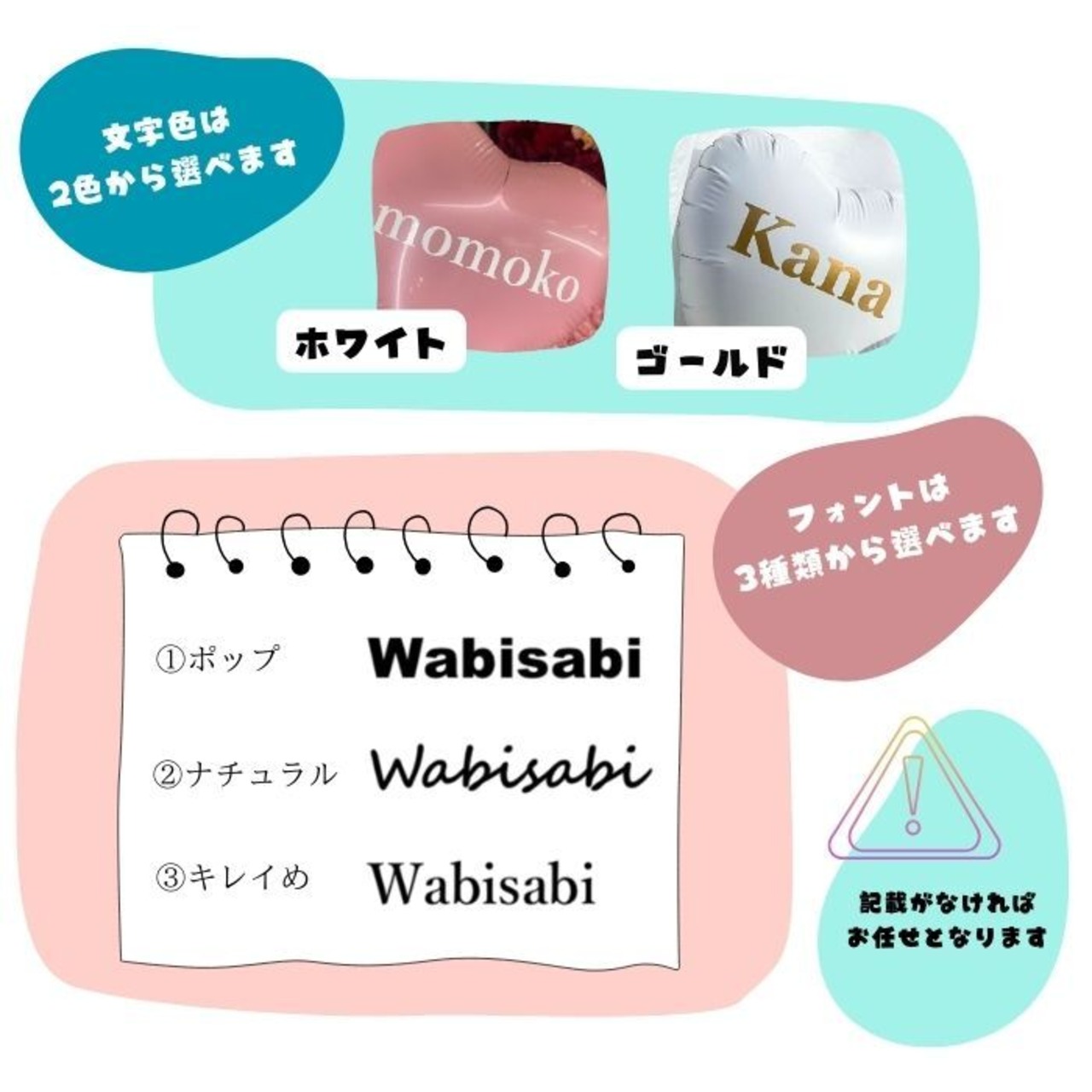 文字記入無い場合は無地バルーンとなり、文字色、フォント指定無い場合はお任せとなります。