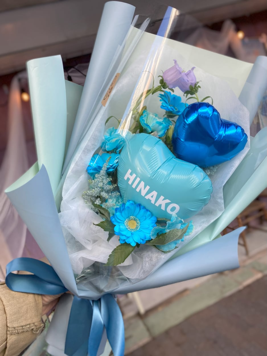 素材は生花の新鮮さを大切にし、バルーンとの組み合わせで特別感を演出しております。