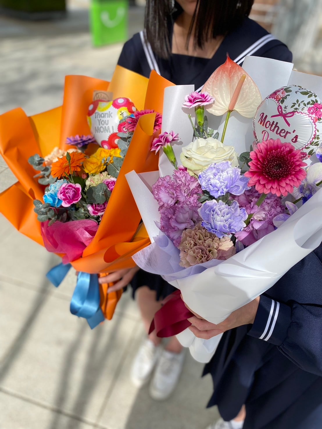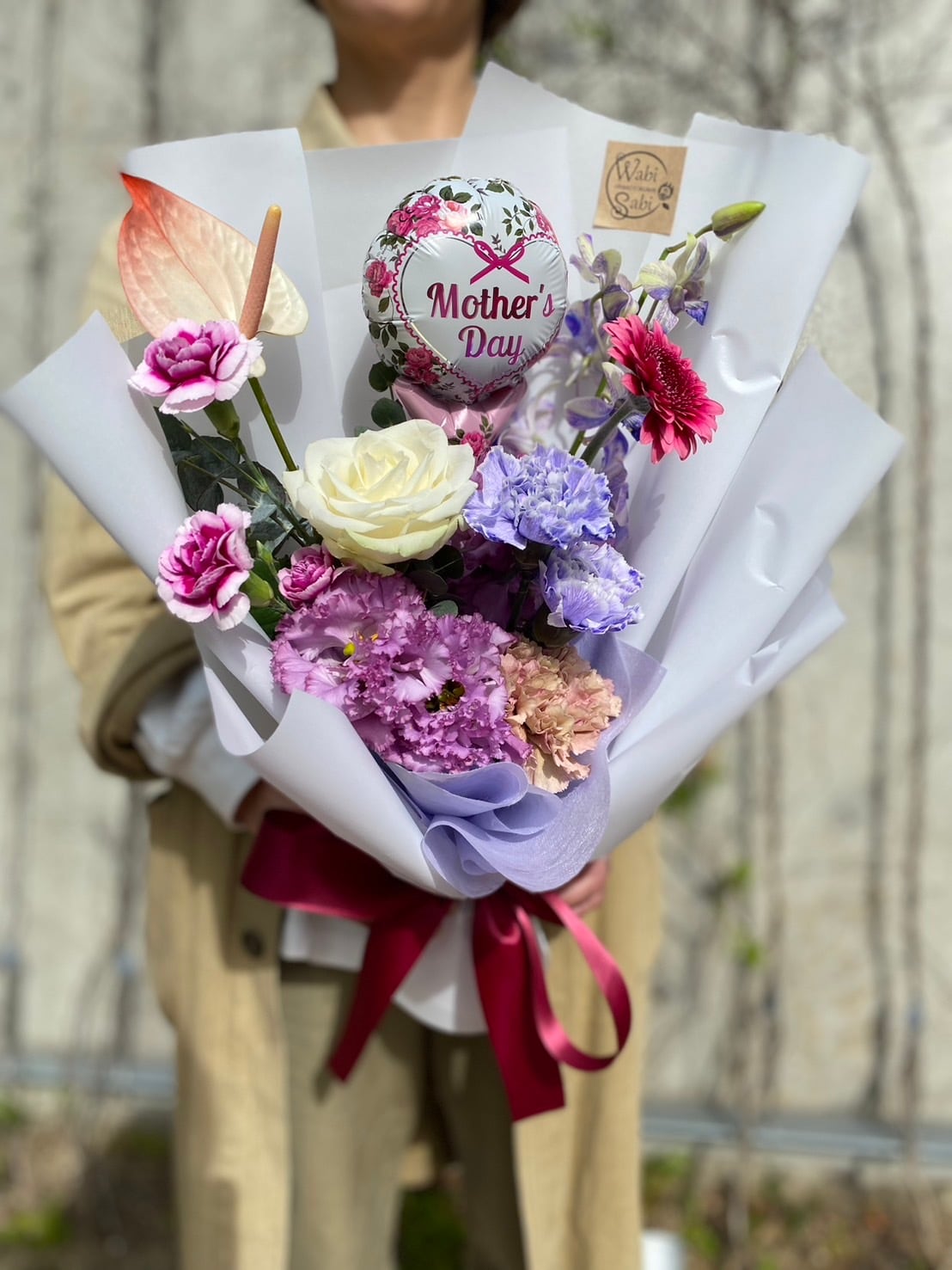 母の日バルーン花束★パープル系エレガントは、『Mother’sDay』と書かれたバルーンのついたかわいい花束。パープル系の色合いが、上品でエレガントな雰囲気を演出し、お母さんへの感謝の気持ちを表現してくれます。バルーンが付いているので、お部屋に飾るだけで一気に華やかな雰囲気に。